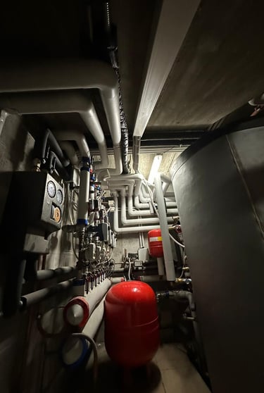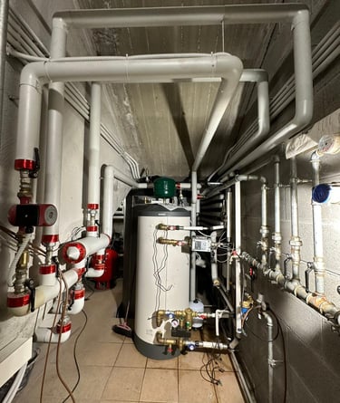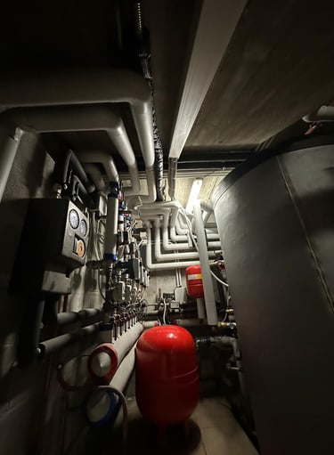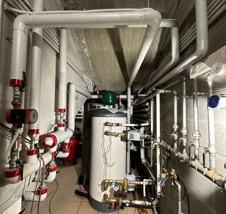 Anche il serbatoio inerziale, con capacità di 200 litri per l’uso quotidiano e 1200 litri per l’accumulo sanitario, è stato scelto con grande attenzione: grazie a questi volumi, la pompa di calore riesce a garantire acqua calda per tutti gli appartamenti anche quando lavora al massimo della potenza.
