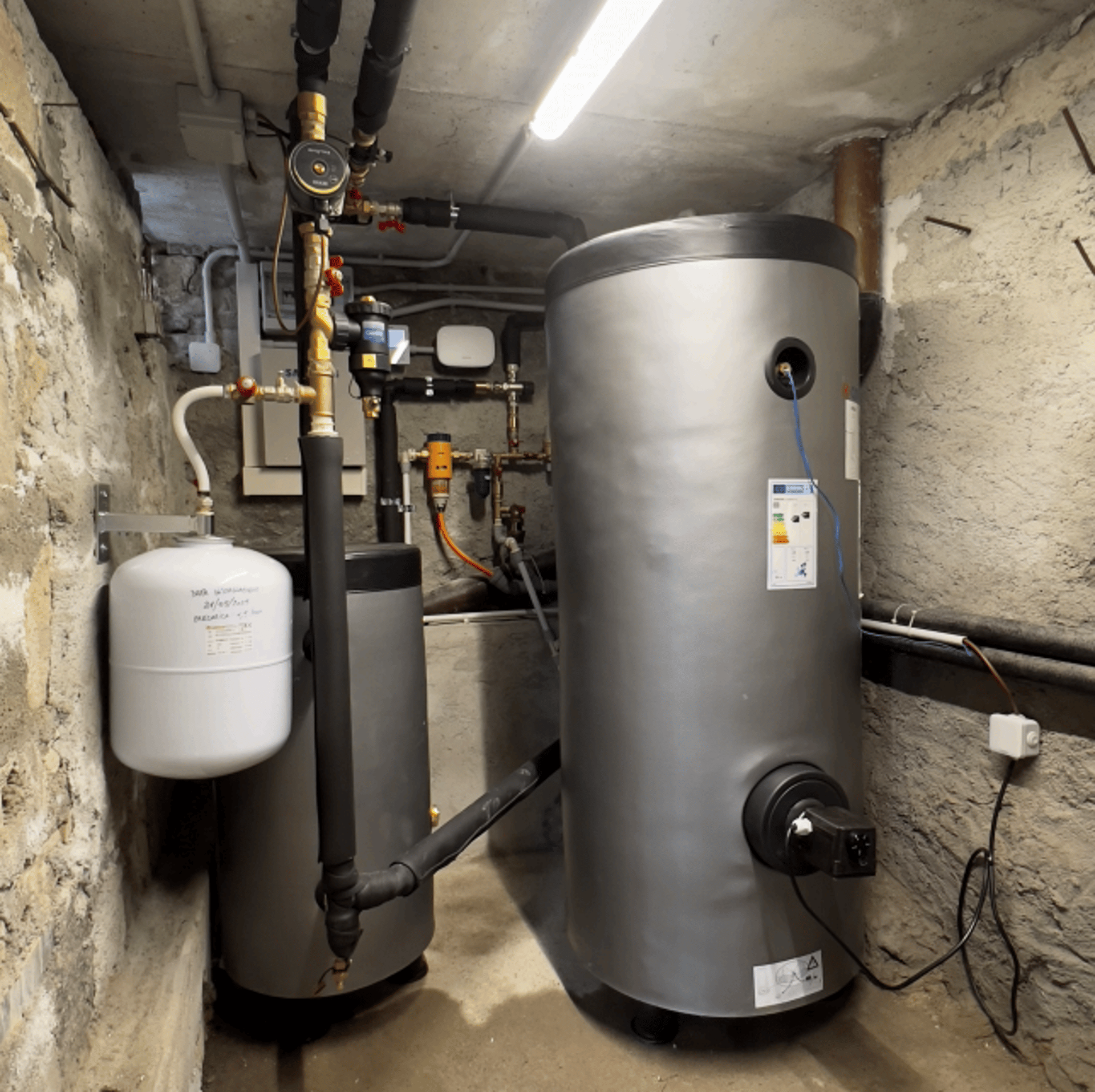 Entrando nella centrale termica, si percepisce subito l’attenzione al dettaglio. Sopra la testa, la pompa di calore Samsung HT Quiet monoblocco da 8 kW convoglia energia all’impianto tramite tubazioni dell’acqua collegate a circolatore, defangatore, valvola di sicurezza e vaso di espansione tarato. L’accumulo dell’acqua calda sanitaria da 300 litri soddisfa le esigenze di una famiglia di cinque persone, mentre l’accumulo inerziale da 100 litri gestisce l’inerzia dell’edificio, permettendo di riscaldare efficacemente la casa anche con una pompa di calore nominalmente sottodimensionata rispetto ai fabbisogni teorici.